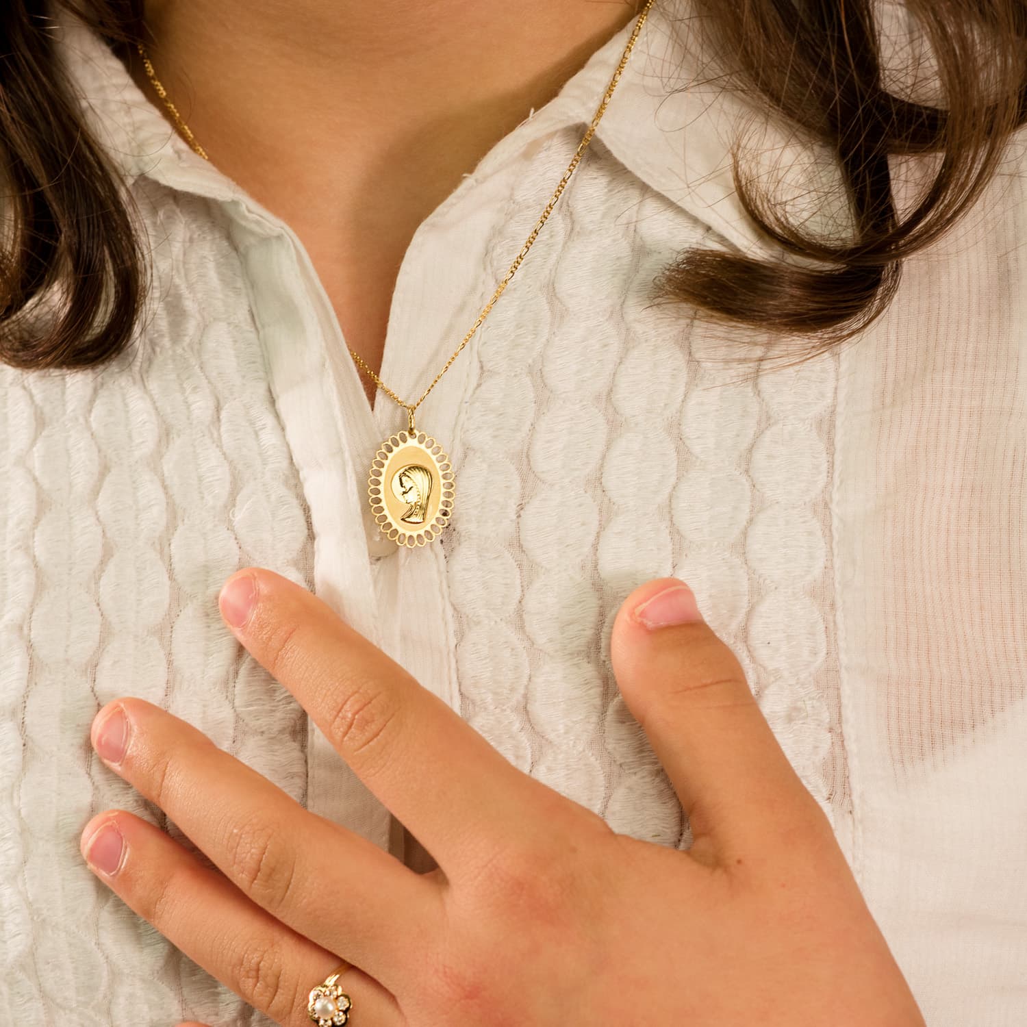 18K MEDALLA ORO AMARILLO VIRGEN NIÑA CERCO OVAL CALADO 21X16 MM