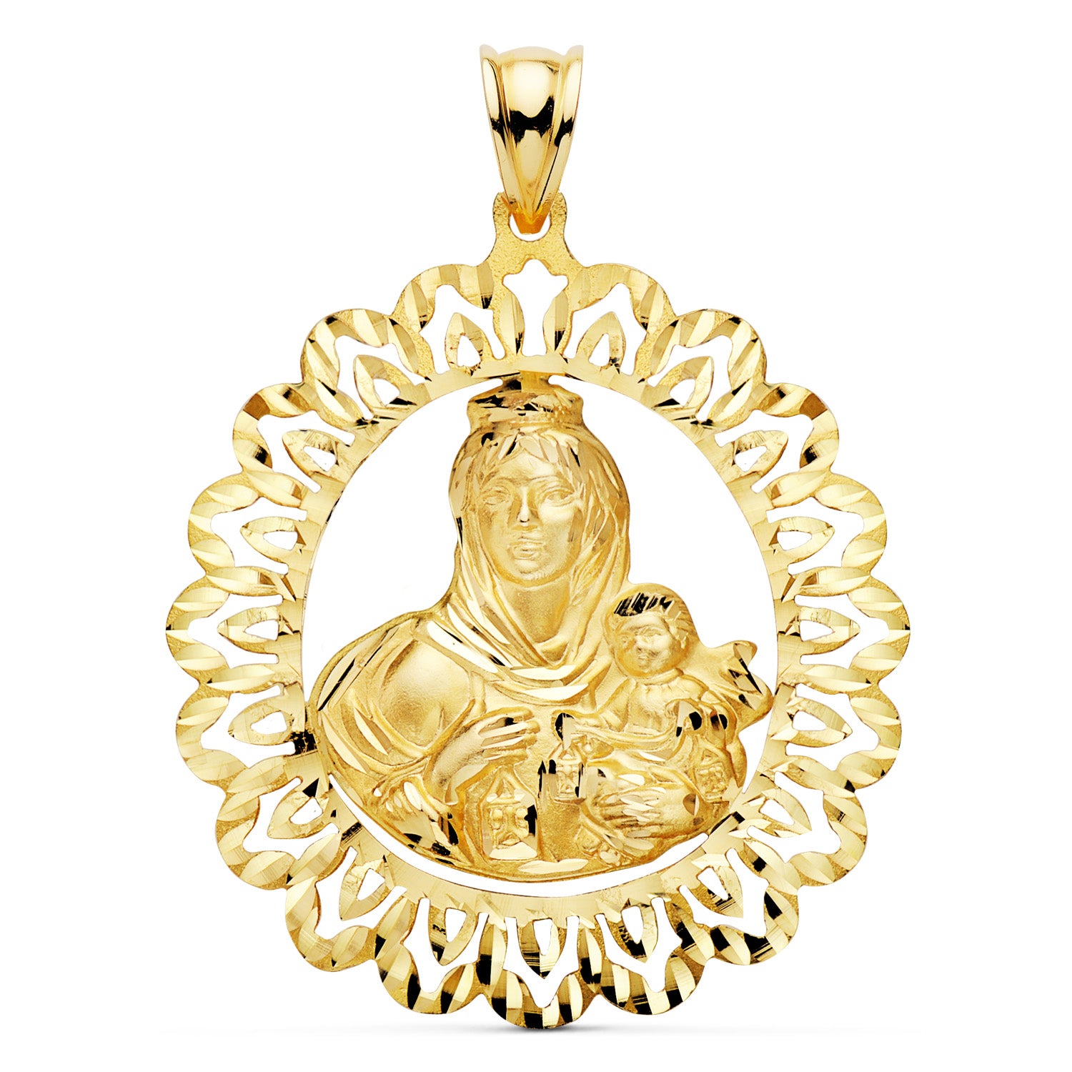 18K MEDALLA ORO AMARILLO VIRGEN DEL CARMEN CERCO TALLADO 41X35 MM